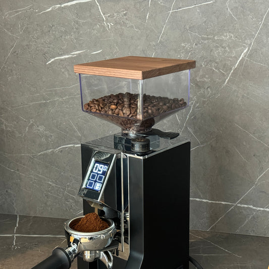 Unter Wahrung der natürlichen Echtholzcharakteristik werden die Deckel geschliffen und mit lebensmittelechtem Lack versiegelt. Die Lackierung erhält die schönen Porenzeichnung sowie die natürliche Haptik des Deckels und garantiert die für den Kaffee so wichtige Geruchs- und Geschmacksneutralität. Die rundum verlaufenden Fasen auf der Oberseite setzen einen moderneren Akzent. Die passgenaue rückseitige Nut gewährt ein sicheres Positionieren des Deckels beim Aufsetzen auf den Bohnenbehälter.