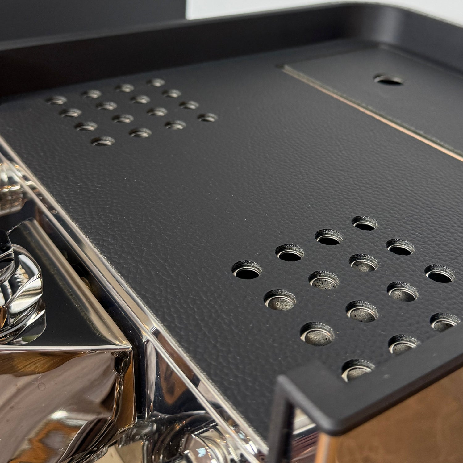 Dank der maschinenspezifischen und passgenauen Fertigung jeder Schutzmatte wurde das Lochbild der Tassenablage exakt übernommen. Deine Tassen können also wie gewohnt vorgewärmt werden.